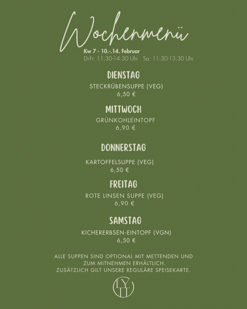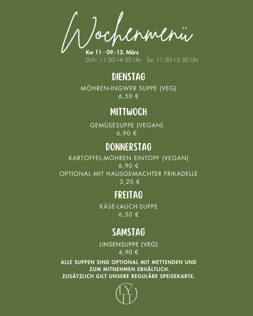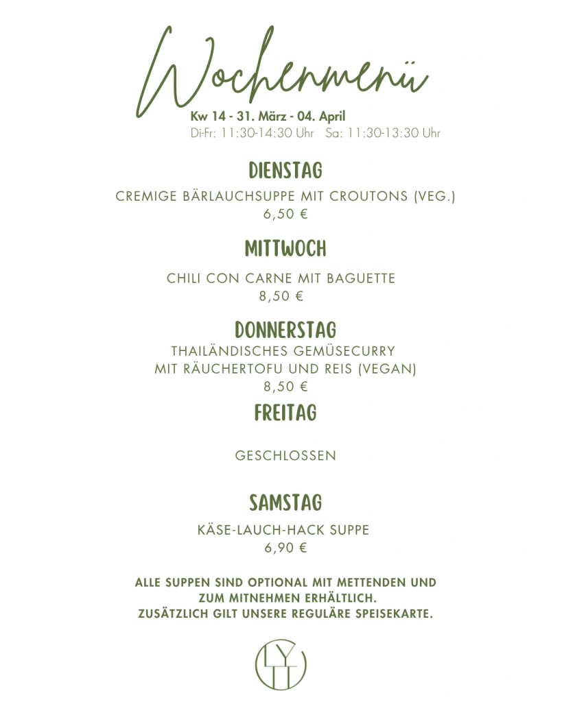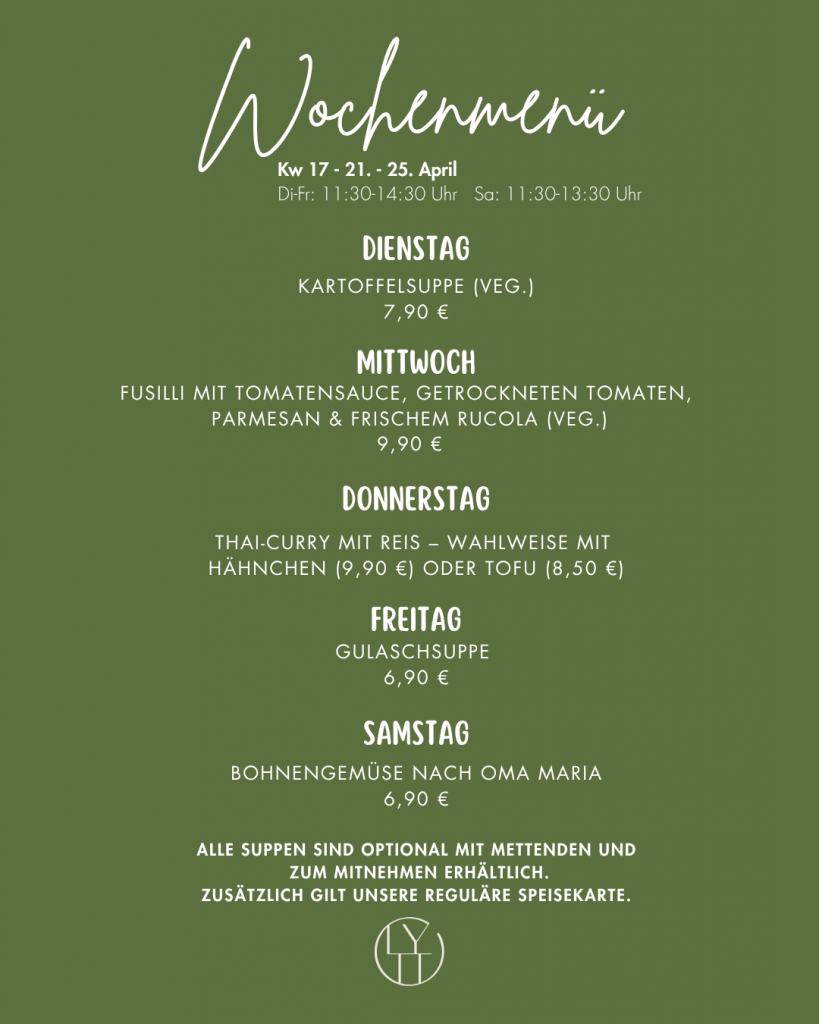 Unsere aktuelle Mittags-Wochenkarte. Zusätzlich dazu gilt immer unsere reguläre Speisekarte.